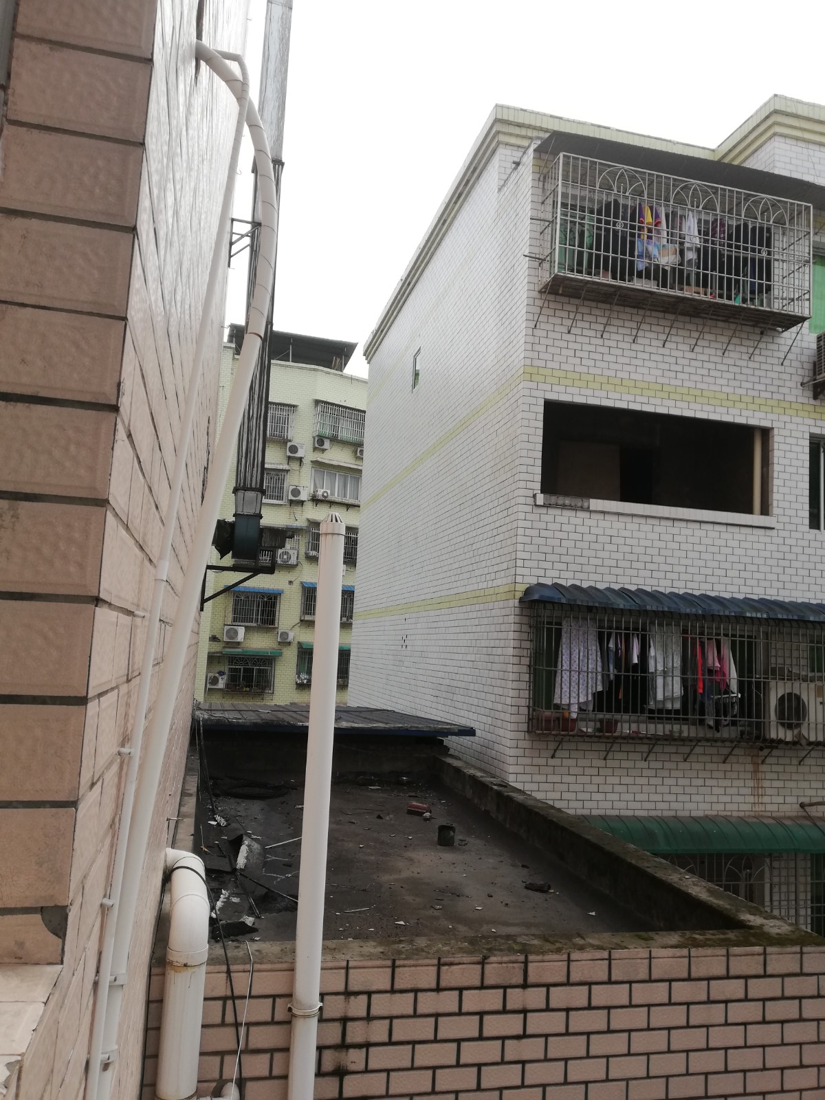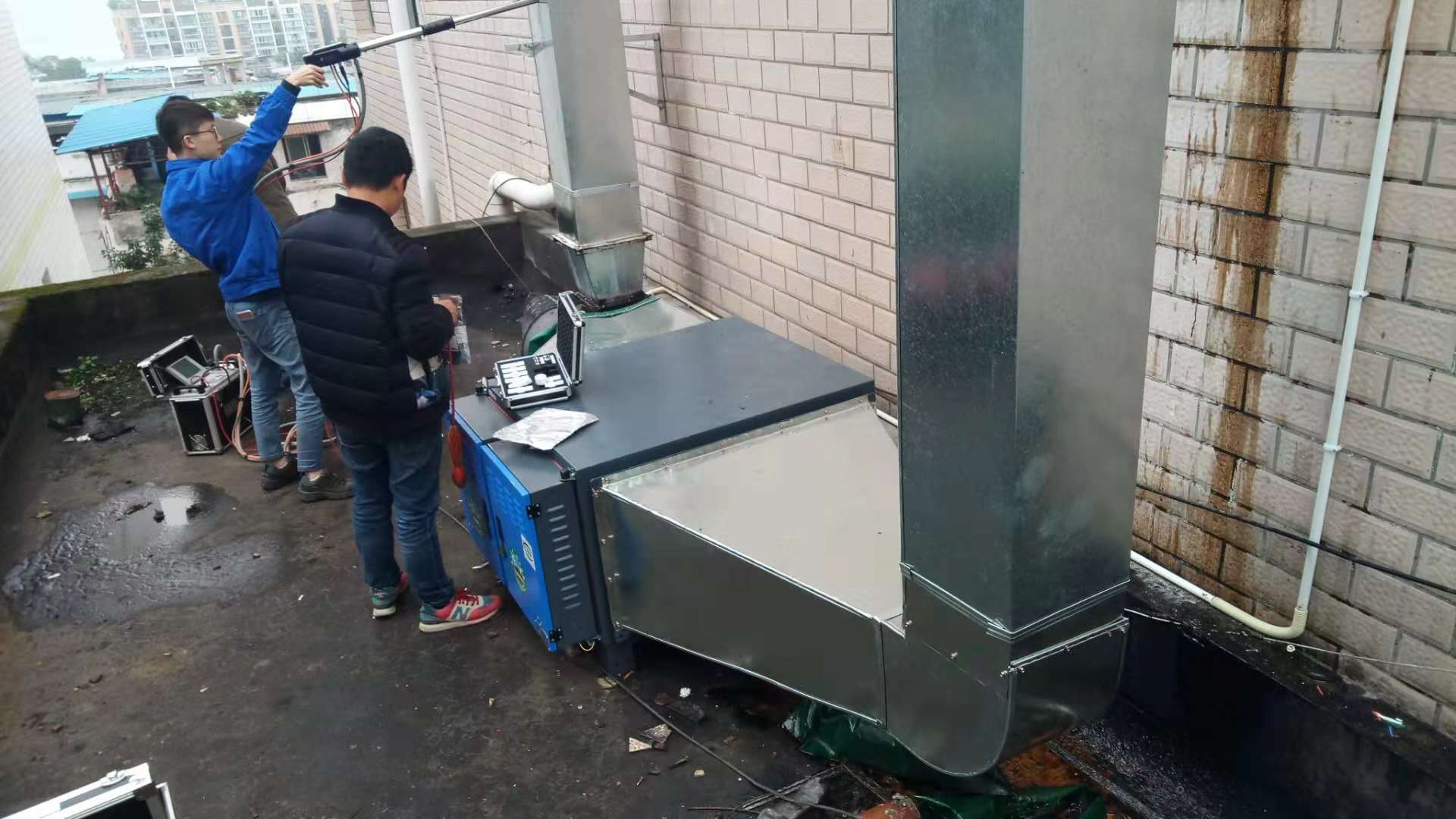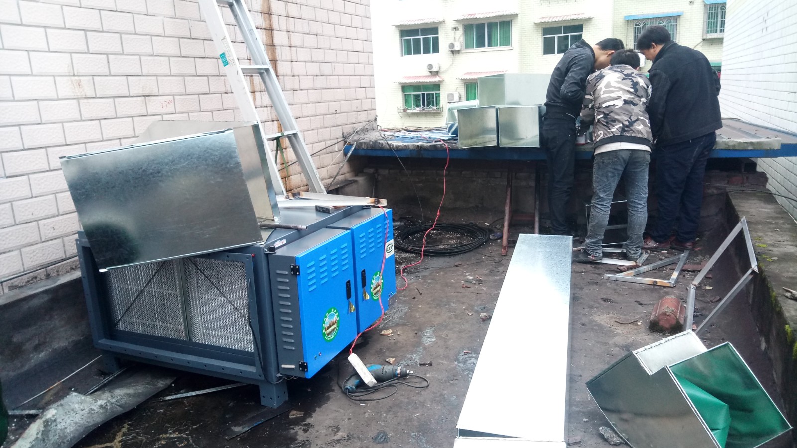 現(xiàn)場(chǎng)情況:就業(yè)局食堂,原有油煙排放未做凈化,山墻二樓平臺(tái)安裝難度大。