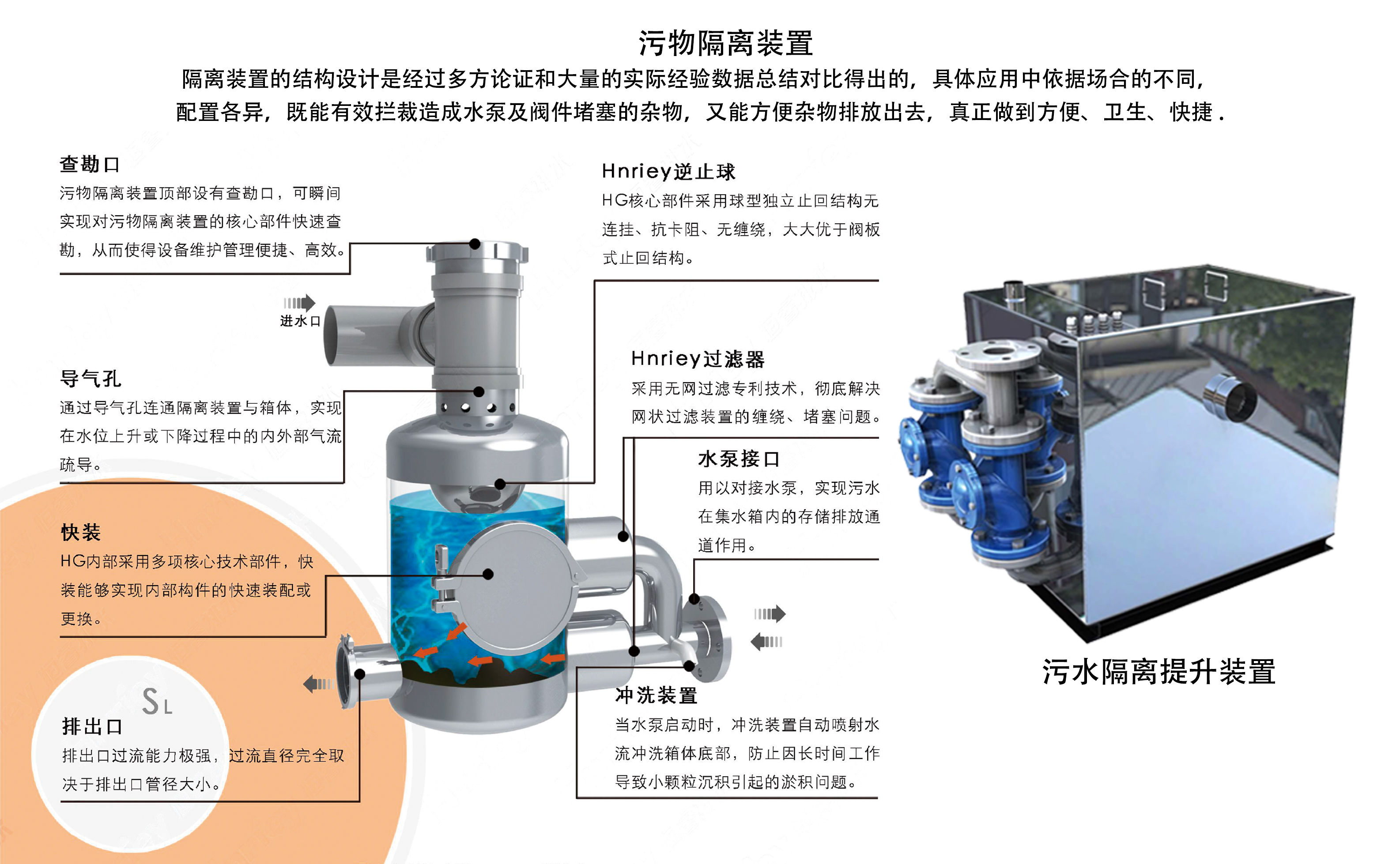 .污物不經(jīng)過(guò)泵腔及集水箱,水泵工作效率極高,集水箱免清掏;